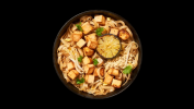 Оризови спагети, тофу, фъстъци, яйца от свободно отглеждани кокошки,кълнове ,пресен лук, лайм и нашия Пад Тай сос